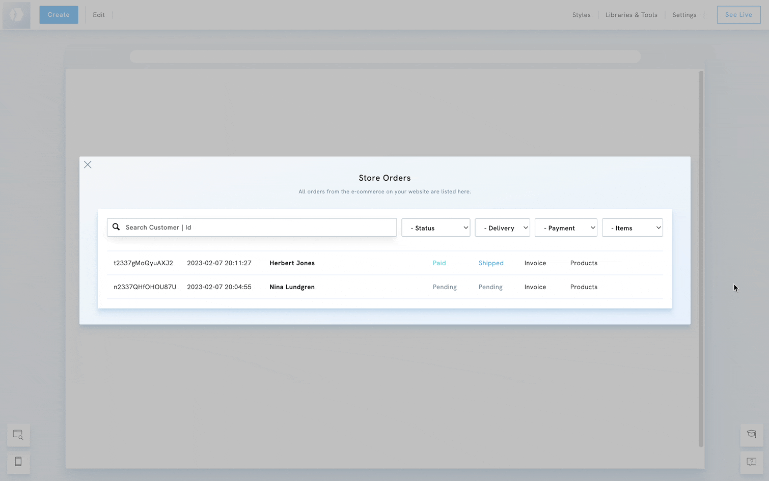 To find your orders, click Libraries & Tools and choose All Orders under E-Commerce Archives. A window of the order list will appear. In the order list, you can search for an order by name or ID, or you can filter the list of orders by selecting the payment status, delivery status, payment method, and item type.