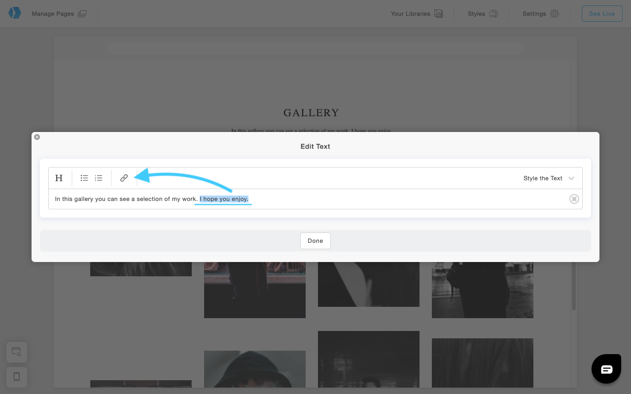 Below, you’ll find how to add links to different types of elements in your portfolio.