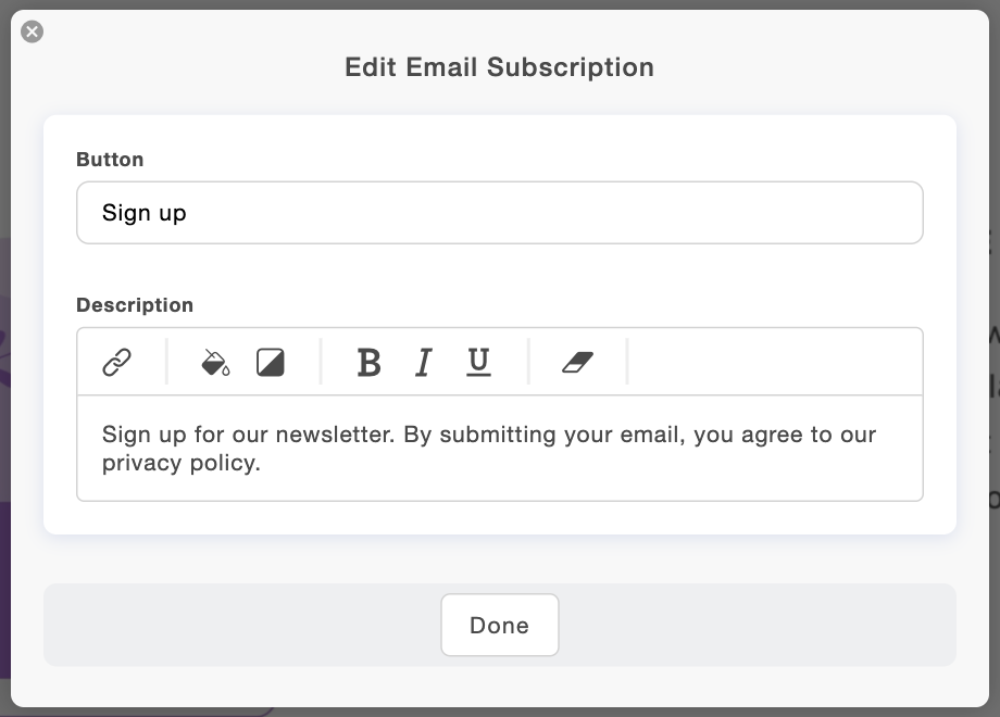 There are several ways to add a newsletter signup form to your page. You can create a Call to Action page, add a Call to Action section to an existing page, or add a newsletter signup element to a section.
