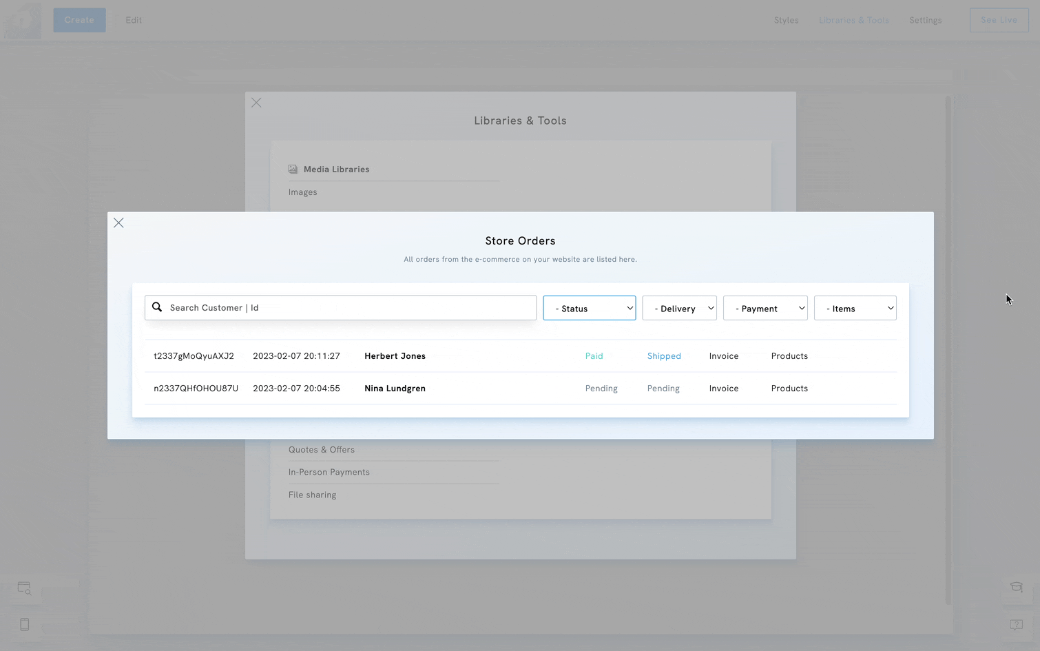 - Filter by payment status, delivery status, payment method, or item type