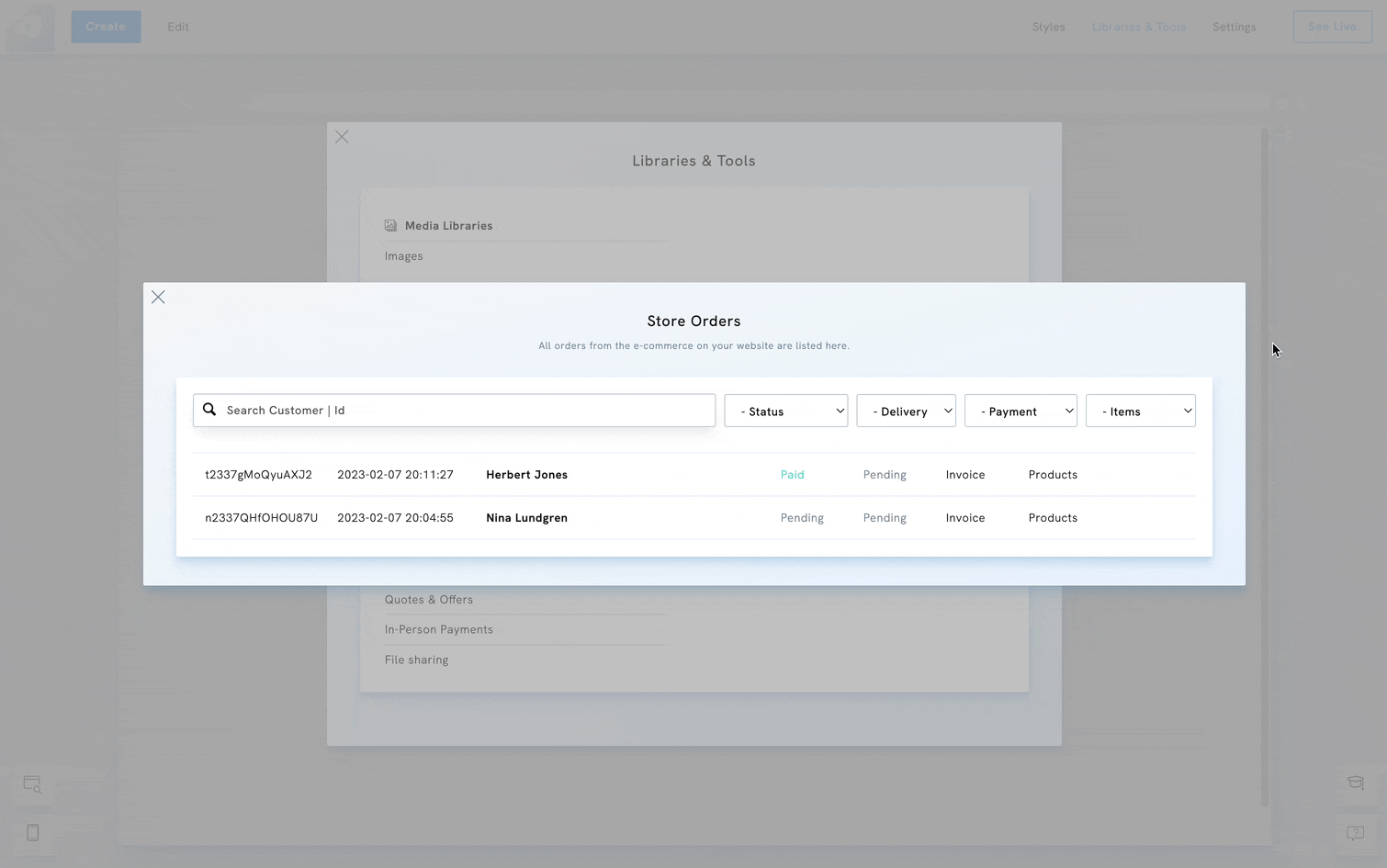 To find your orders, click Libraries & Tools and choose All Orders under E-Commerce Archives. A window of the order list will appear. In the order list, you can search for an order by name or ID, or you can filter the list of orders by selecting the payment status, delivery status, payment method, and item type.