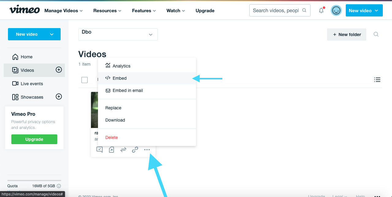 - A list of uploaded videos will appear. Click on the three dots near your video and select the option Embed